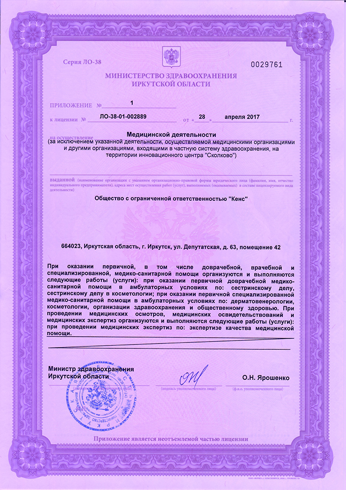 Лицензия № ЛО-38-01-002889 от 28.04.2017 (бланк лицензии серия ЛО-38 № 0003578) на осуществление следующих видов медицинской деятельности: Первичная доврачебная медико-санитарная помощь в амбулаторных условиях: Сестринское дело; Сестринское дело в косметологии; Первичная специализированная медико-санитарная помощь в амбулаторных условиях: Дерматовенерология; Косметология; Организация здравоохранения и общественное здоровье Проведение медицинских осмотров, медицинских освидетельствований и медицинских экспертиз: Экспертиза качества медицинской помощи. Лицензирующий орган: Министерство здравоохранения Иркутской области, почтовый адрес: 664003, г. Иркутск, ул. Карла Маркса, 29, тел. +7 (3952) 24-05-86